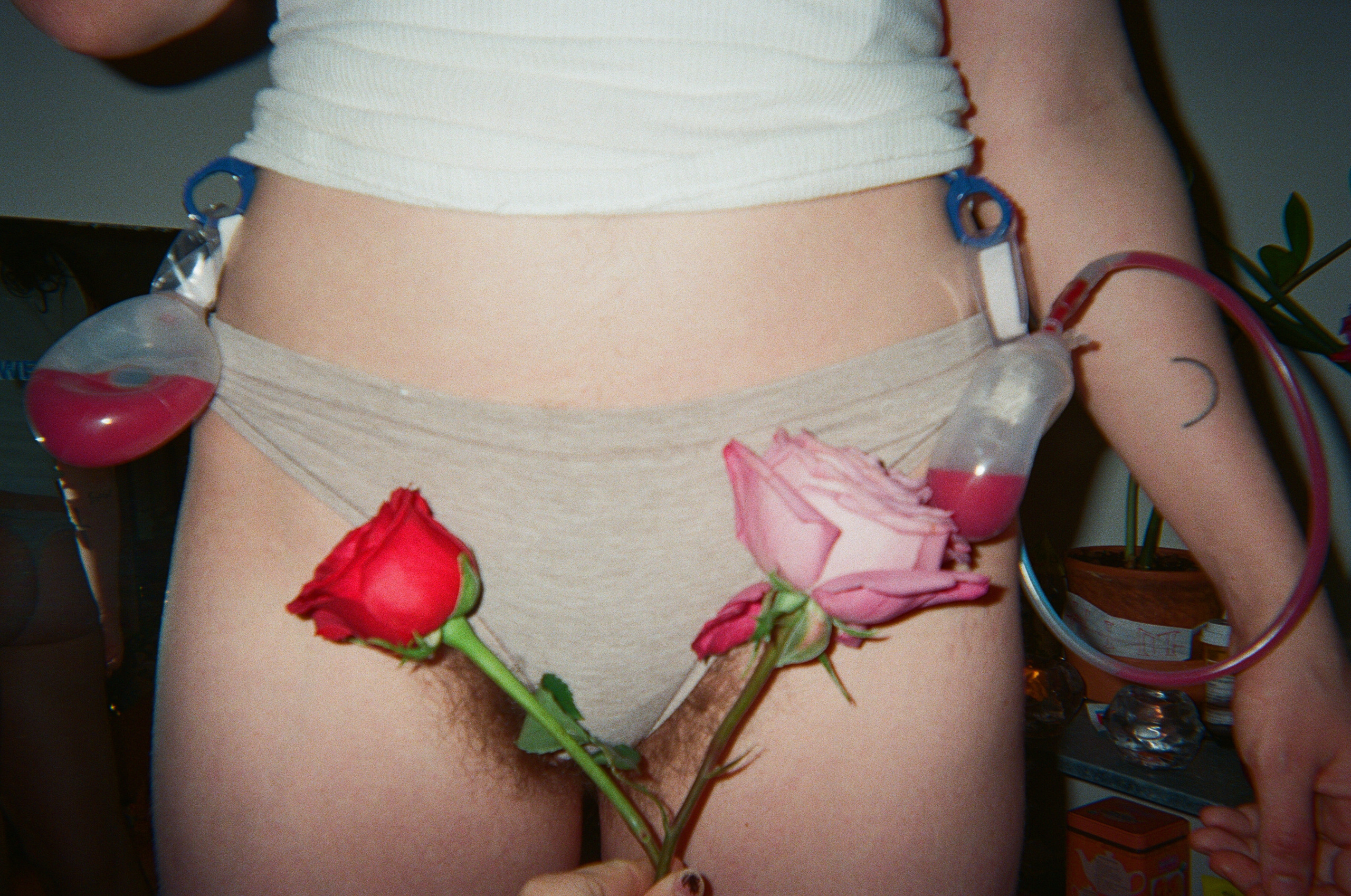 A unique slideshow documenting two long-haired trans men falling madly in love. Over the course of one year, the artist couple Samira Elagoz & Z Walsh gathered photographs from real-life events such as their first kiss, meeting each other’s parents, long-distance thirst traps, a beach wedding, and top surgery and its subsequent recovery. A sweet and steamy celebration of T4T love with life and art all tangled up.
